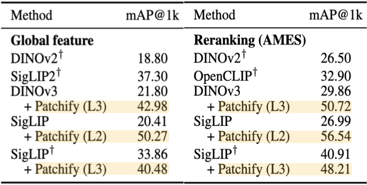 Patchify provides interpretable matching by localizing where retrieval evidence comes from, improves performance via local cues, and scales efficiently with product quantization.